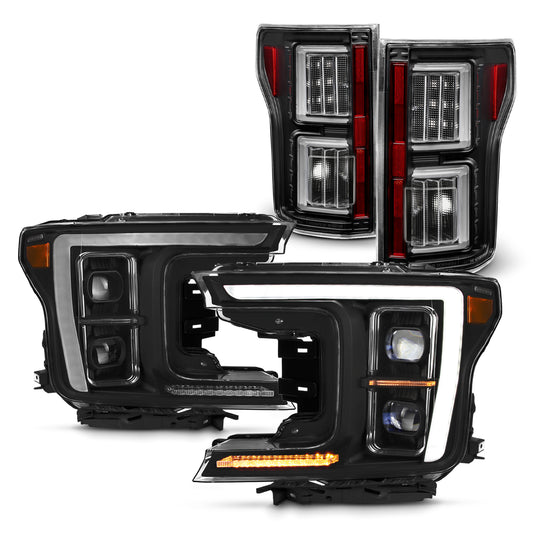 Regular price $899.99This is a 100% brand new pair of Headlights in Black Housing Clear Lens & Tail lights in Red CLear Lens Compatible With: 2018-2020 Ford F150 ***Compatible with Factory Halogen Headlight Model Only*** ***ATTN: Not Compatible... -