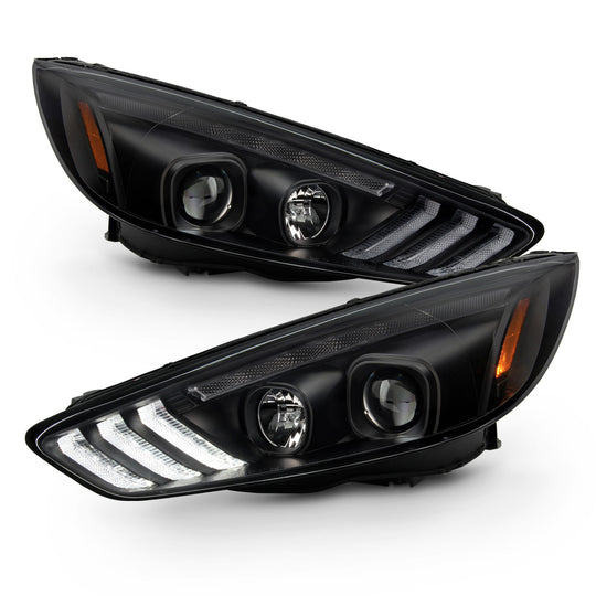 AKKON - Fits 15-18 Ford Focus S | SE | ST | Titanium [Halogen Type] LED DRL Black Projector Headlights + Sequential Turn Signal
