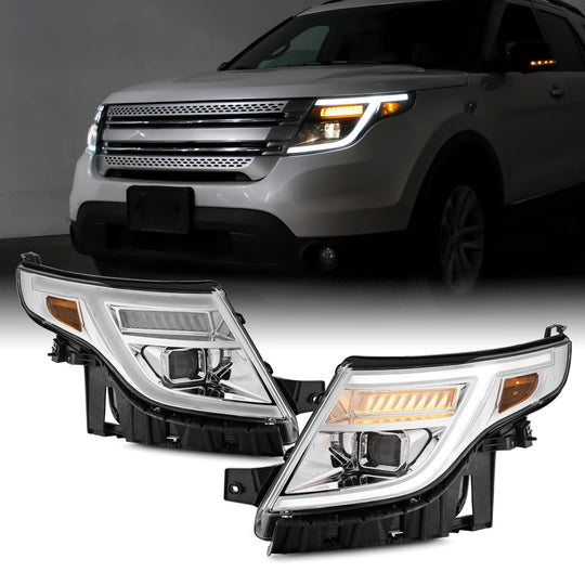 AKKON - Fits 2011-2015 Ford Explorer Halogen Type Projector Chrome Headlights Pair w/LED Tube DRL Sequential Turn Signal