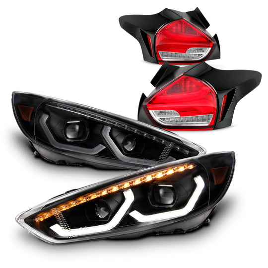 AKKON - Fits 2015-2017 Ford Focus Hatchback Full-LED Sequential Light Tube Projector Headlights + Tail Lights Combo