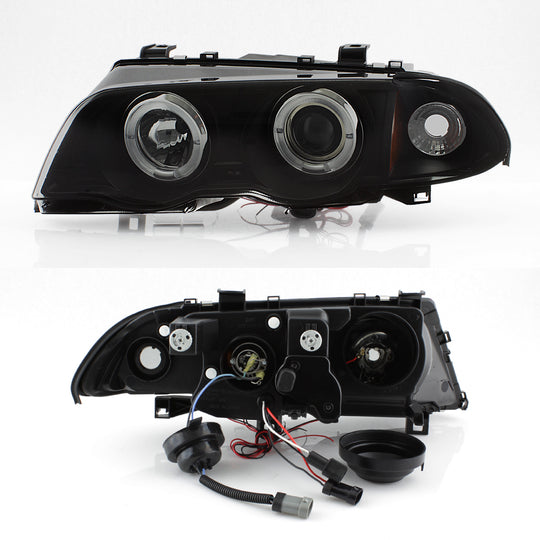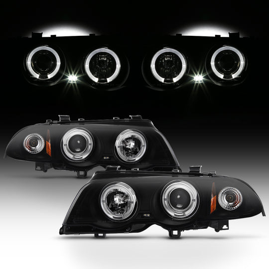 AKKON - For BMW E46 3-Series 4 Doors Sedan Black Smoked Halo Ring LED Projector Headlights Replacement Left+Right