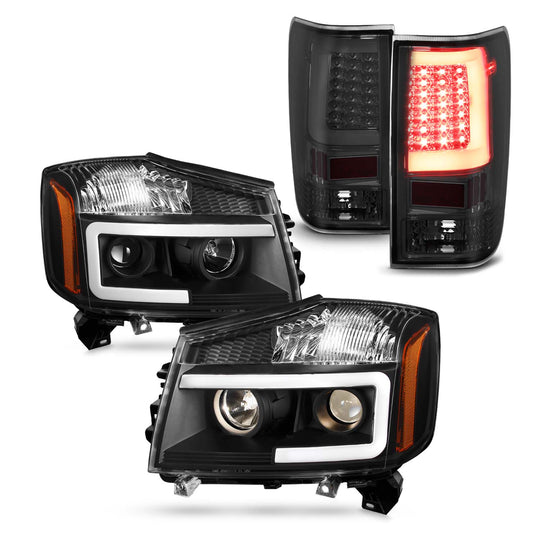 AKKON - Fits 2004-2015 Tian LED DRL Parking Projector Black Headlights + LED Tube Running Signal Smoked Tail Lights Pair
