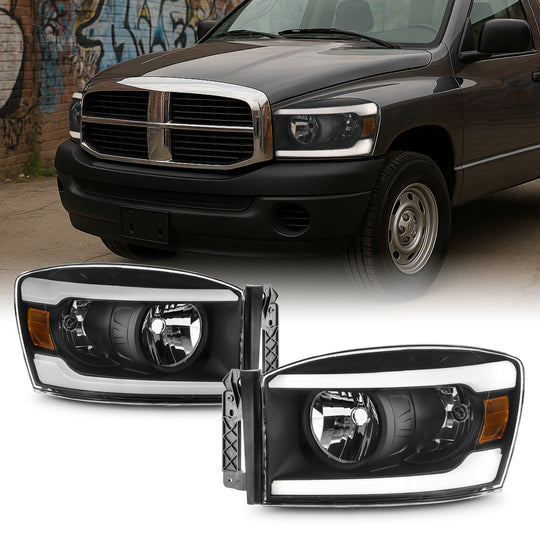 AKKON - Fits 2006-2008 Dodge Ram 1500 2500 3500 Black Housing Headlights Pair Left + Right w/ LED Tube DRL