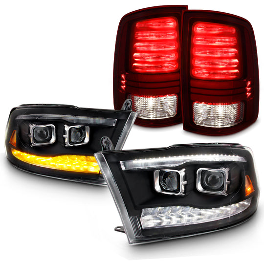 AKKON - Fits 2013-2018 RAM 1500 2500 3500 LED DRL [Dual Projector] Black Headlights+ LED Red Smoked Tail Lamp w/Wire Set