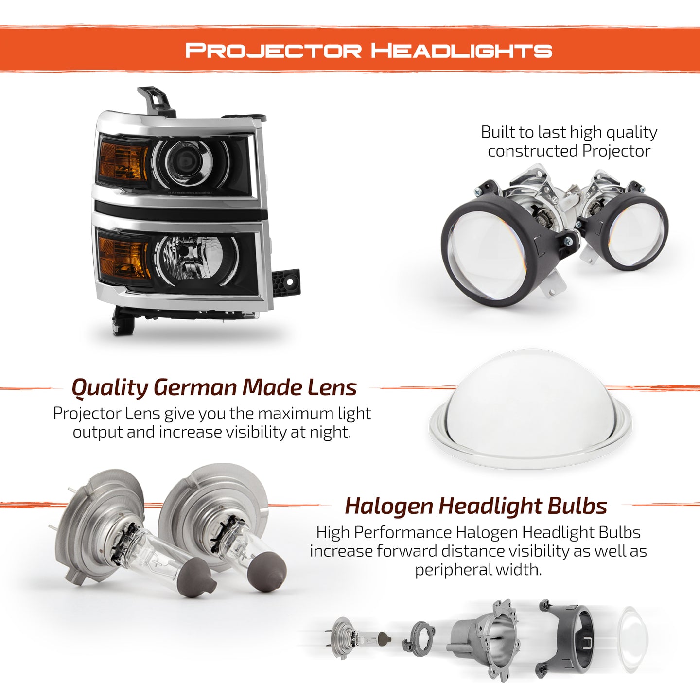 AKKON - Fit 2014-2015 Chevy Silverado 1500 14-15 Halogen Type Projector Headlights OE Style Headlamp Black Housing Driver Passenger Direct Replacement
