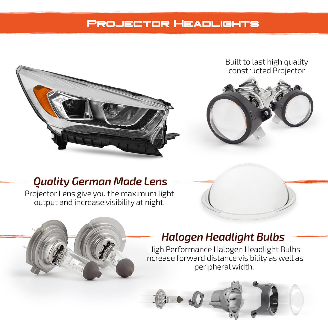 AKKON -Fits 2017-2019 Ford Escape [Halogen Type] Projector Chrome Bezel Headlight Passenger Right Side w/LED DRL Running