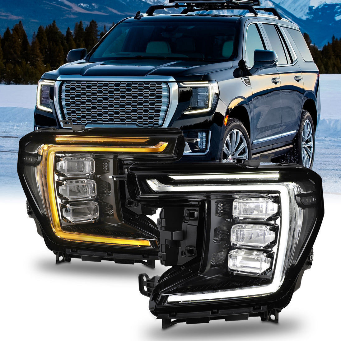 AKKON - Fit 2021-2023 GMC Yukon XL SLE | SLT Full LED Chrome Headlight Pair Left+Right w/ Switchback Running Turn Signal