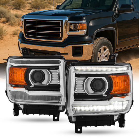 AKKON - Fit 2014-2018 GMC Sierra 1500/ 15-19 Sierra 2500HD|3500HD Halogen w/LED DRL Chrome Bezel Projector Headlight OE Style Driver Passenger Assembly
