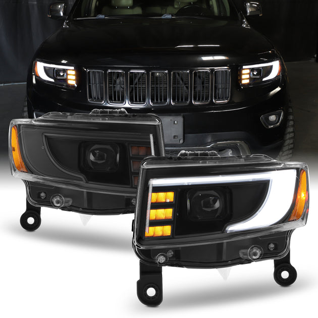AKKON - Fit 2014 2015 2016 Jeep Grand Cherokee [Full LED] Tube Bar DRL w/ Sequential Signal Projector Headlights Black Housing Direct Replacement Headlamps