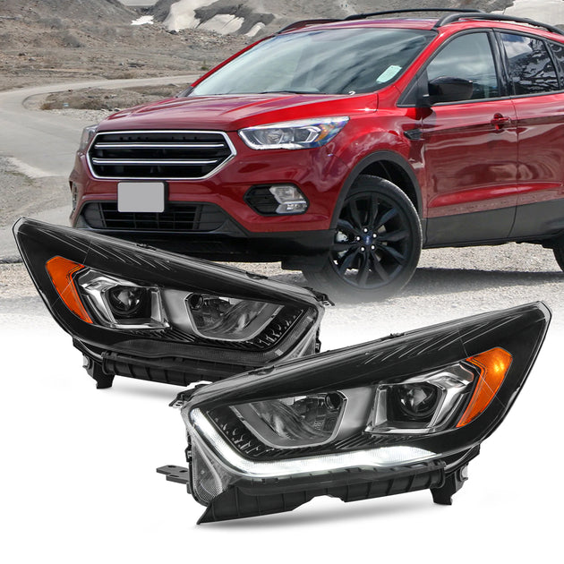 AKKON - Fits 2017-2019 Ford Escape Halogen Type Projector Black Bezel Headlights Pair Driver+Passenger w/LED DRL Running
