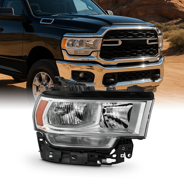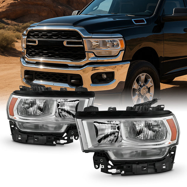 AKKON - Fit 2019 2020 2021 2022 2023 2024 Dodge Ram 2500|3500 Chrome Bezel Halogen Type Headlight Headlamp OE Style Driver - Passenger Direct Replacement