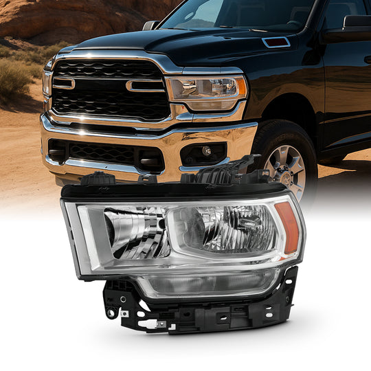 AKKON - Fit 2019 2020 2021 2022 2023 2024 Dodge Ram 2500|3500 Chrome Bezel Halogen Type Headlight Headlamp OE Style Driver - Passenger Direct Replacement