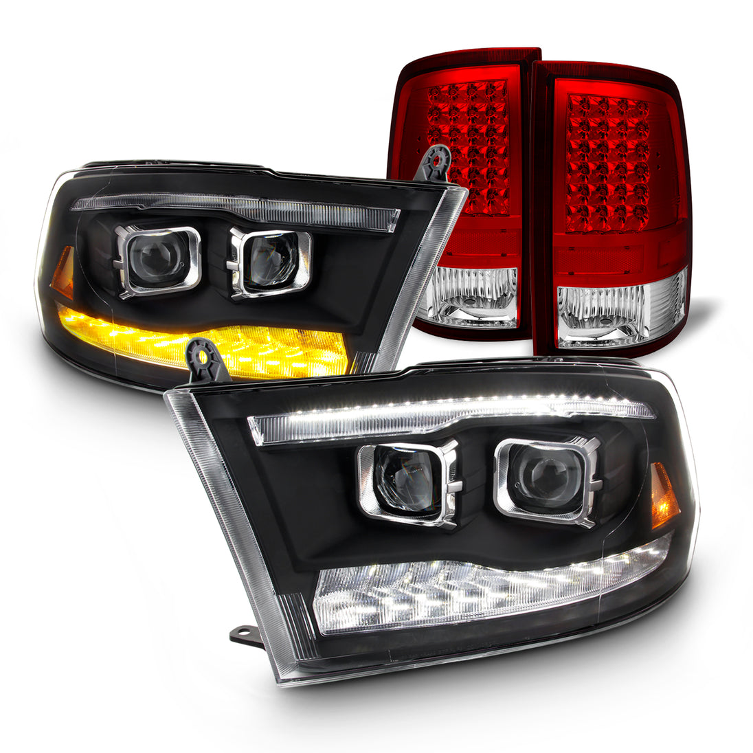 AKKON - For 09-18 Doul LED For Dodge Ram Headlights Projector Housing + Red Chrome Tail Lights Lens