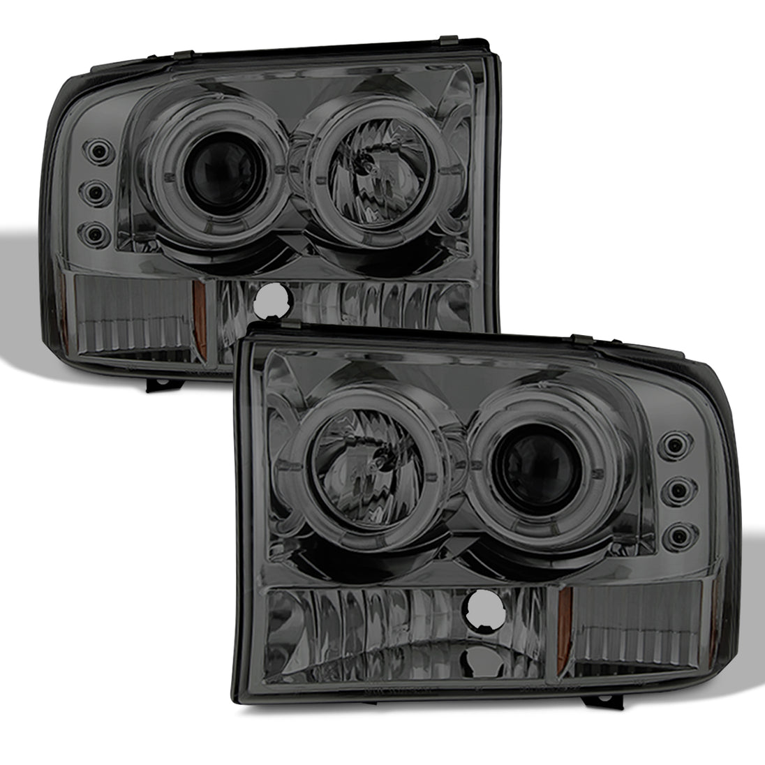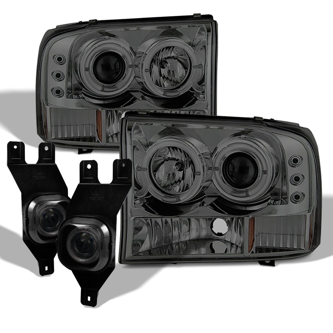 AKKON - For Ford F-Series SuperDuty Excursion 90-04 Smoke Dual Halo Projector Headlights Replacement + Halo Fog Lamp