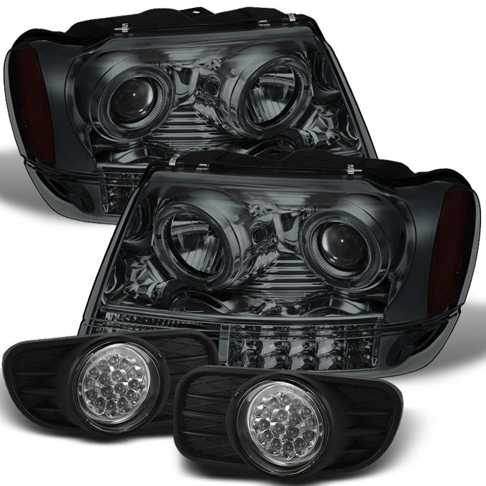 Fits 99-04 Grand Cherokee Smoke Halo Projector Headlights+LED Fog Lamps W/Switch