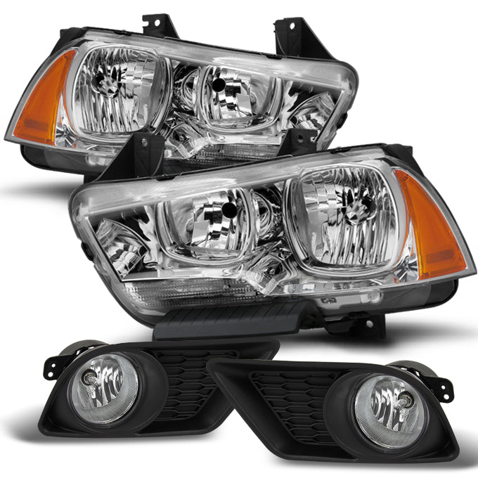 AKKON - For Dodge 11-14 Charger Chrome Housing Headlights + Fog Light w/Switch Replacement