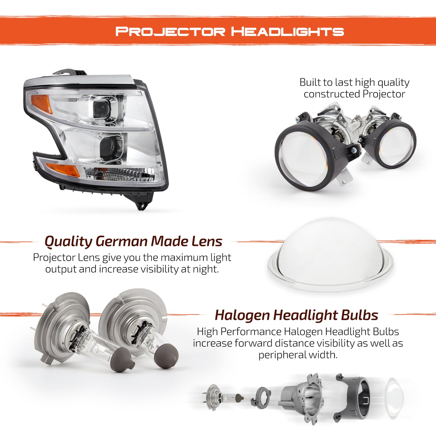 For 2015-2020 Suburban Tahoe LED DRL Tube Chrome Projector Headlights+6000K HID