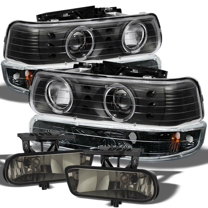 Fits 99-02 Silverado Black Halo Projector LED Headlights+Black Bumper Signal+Fog