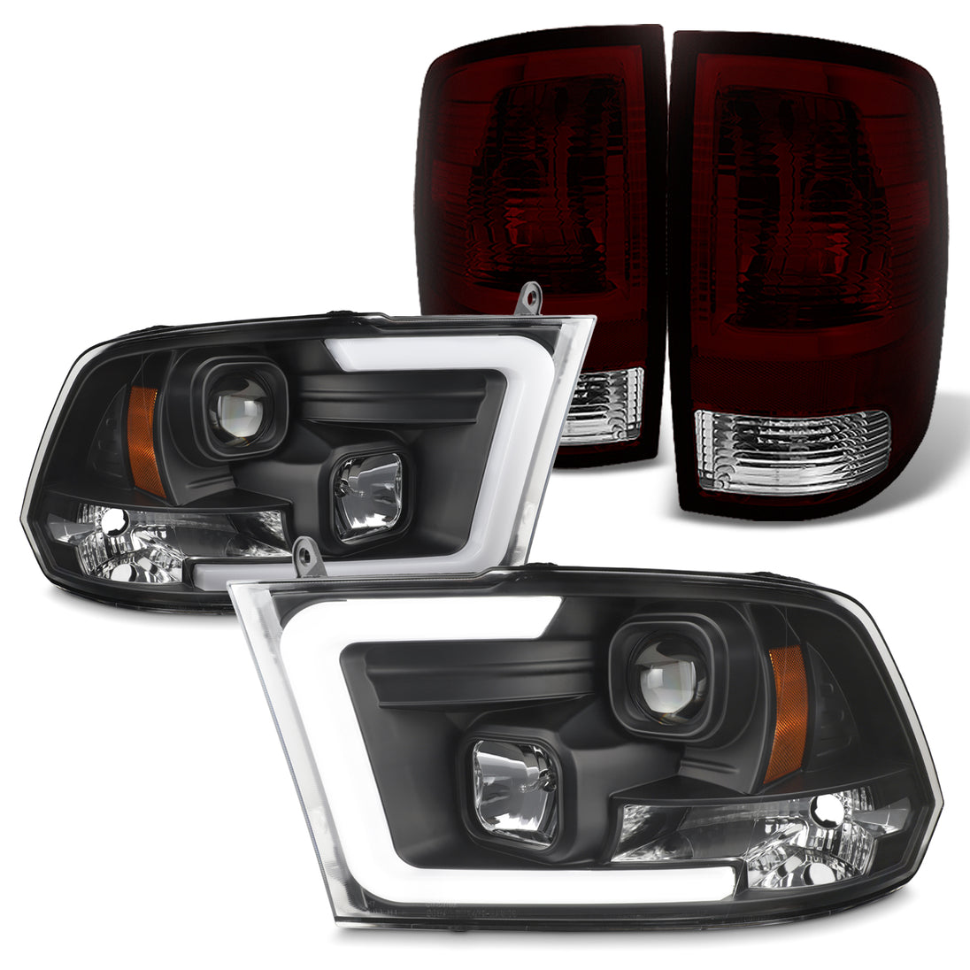 AKKON - Fit 2009-2019 Dodge Ram 1500 2500 3500 Halogen w/LED Sequential Projector Headlights + OE Style Red Smoked Tail Lights