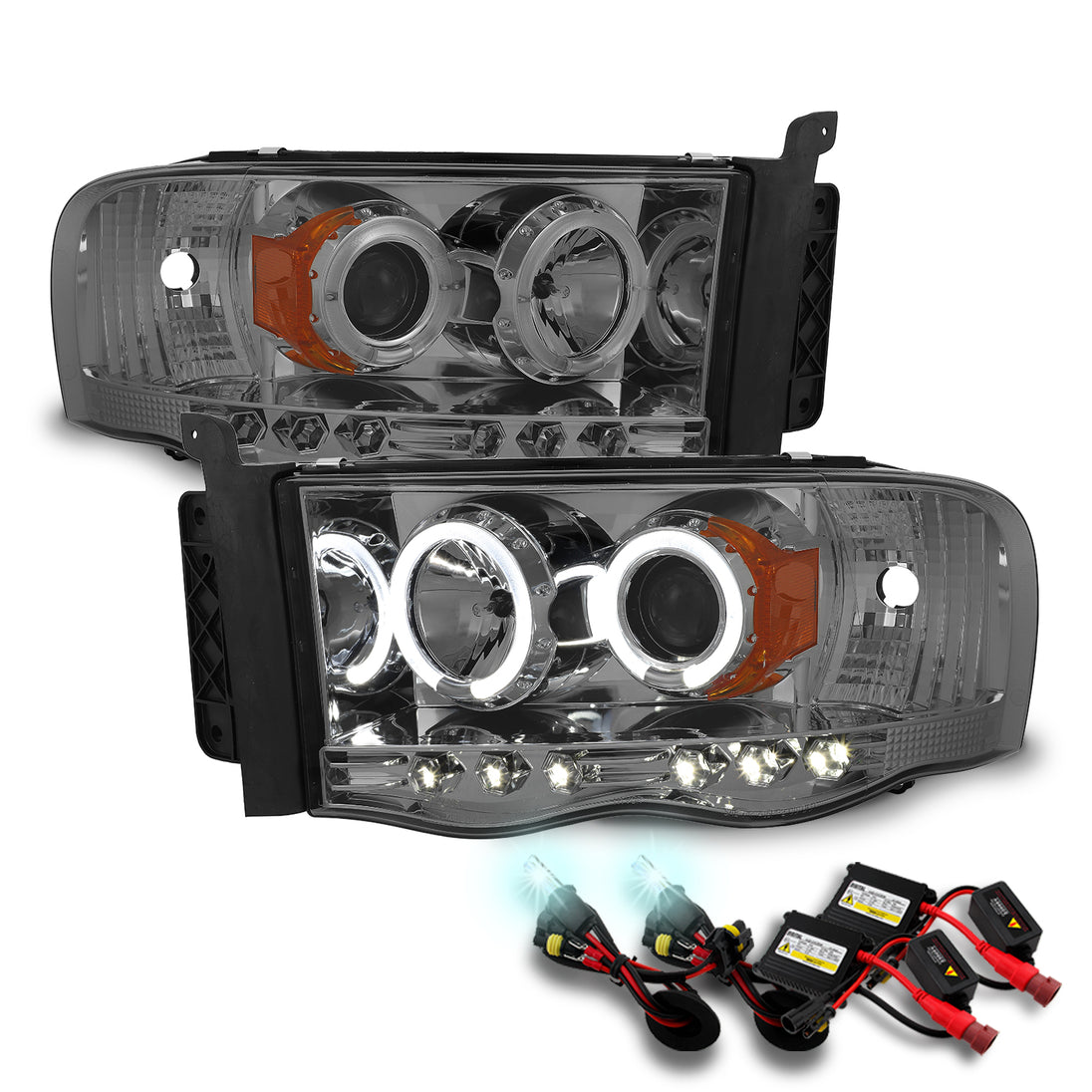 AKKON - For 2003-05 Dodge Ram + 2002 Ram 1500 Dual Halo DRL Projector LED Headlights + 8000K HID Kit [Smoke Chrome]