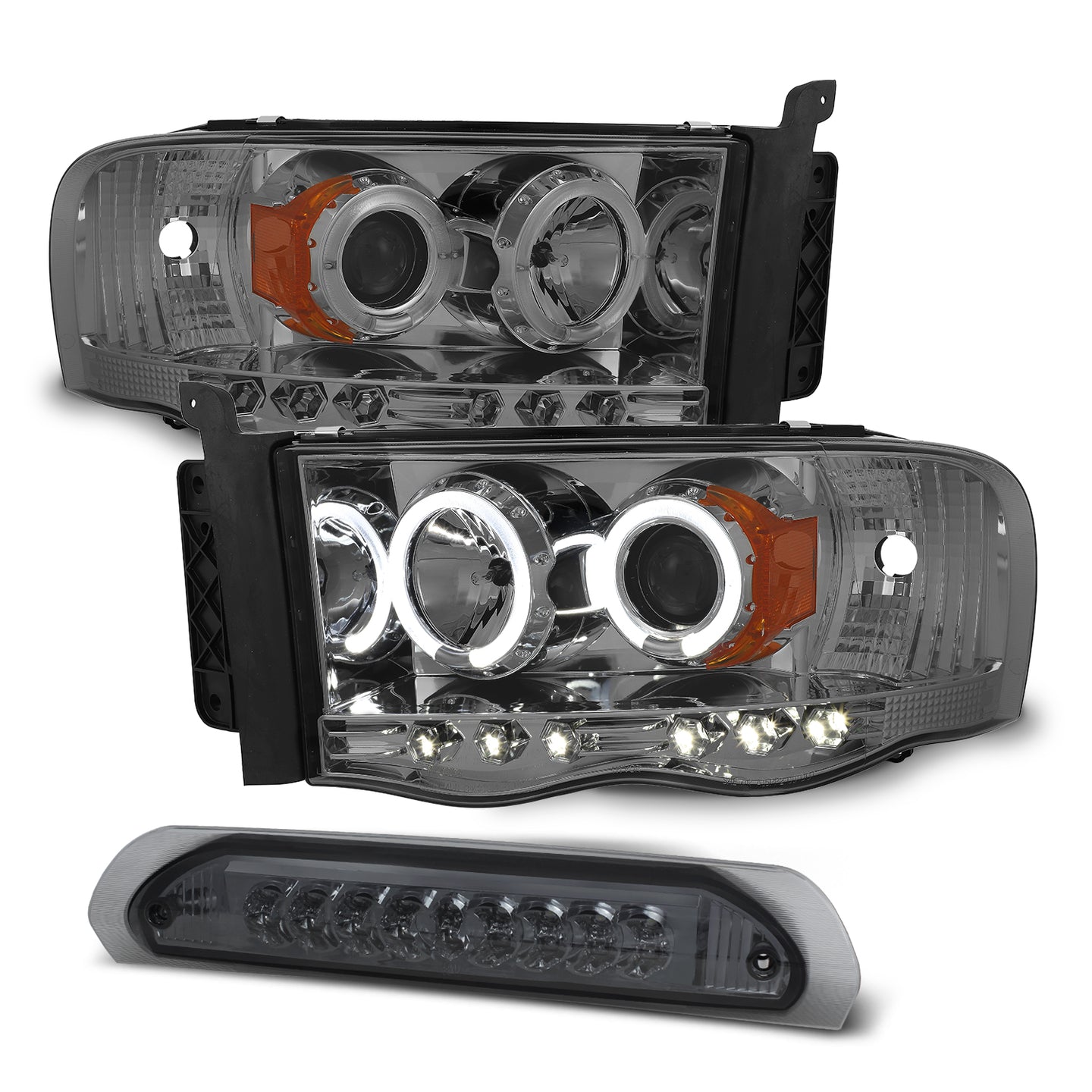 AKKON - For 2003-05 Dodge Ram + 2002 Ram 1500 Dual Halo DRL Projector LED Headlights + 3rd Brake Lamp [Smoke Housing]