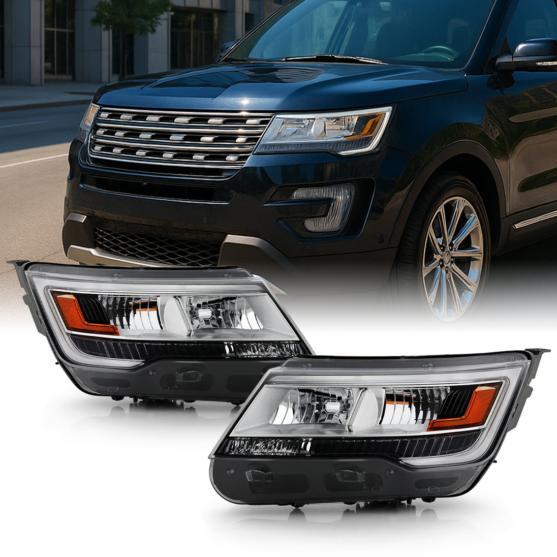 AKKON - For 2016-2019 Ford Explorer Sport | Limited | Platinum | XLT Light Tube LED DRL OE Chrome Headlights - Pair