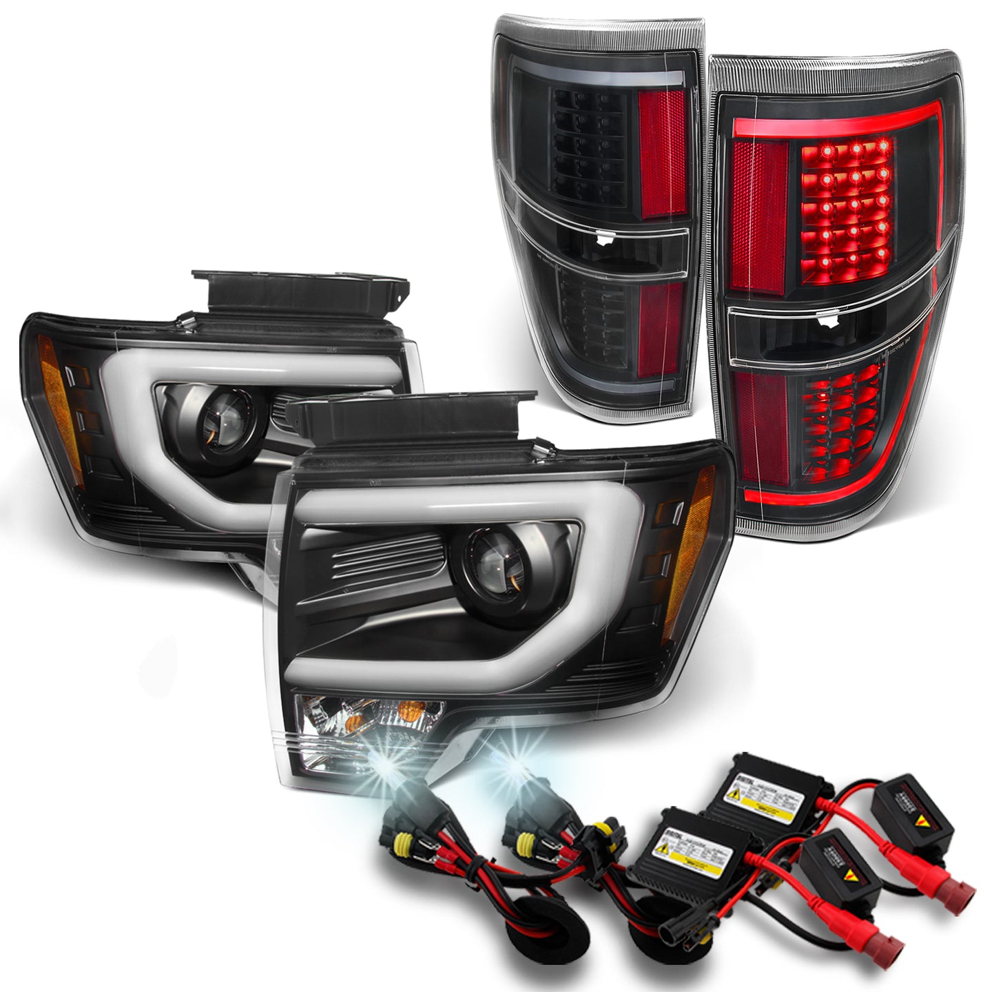 AKKON - Fits 2009-2014 F150 LED Strip Projector Black Headlights + LED [C-Light Bar] Tail Lamp + 6000K HID Slim Xenon Kit Combo