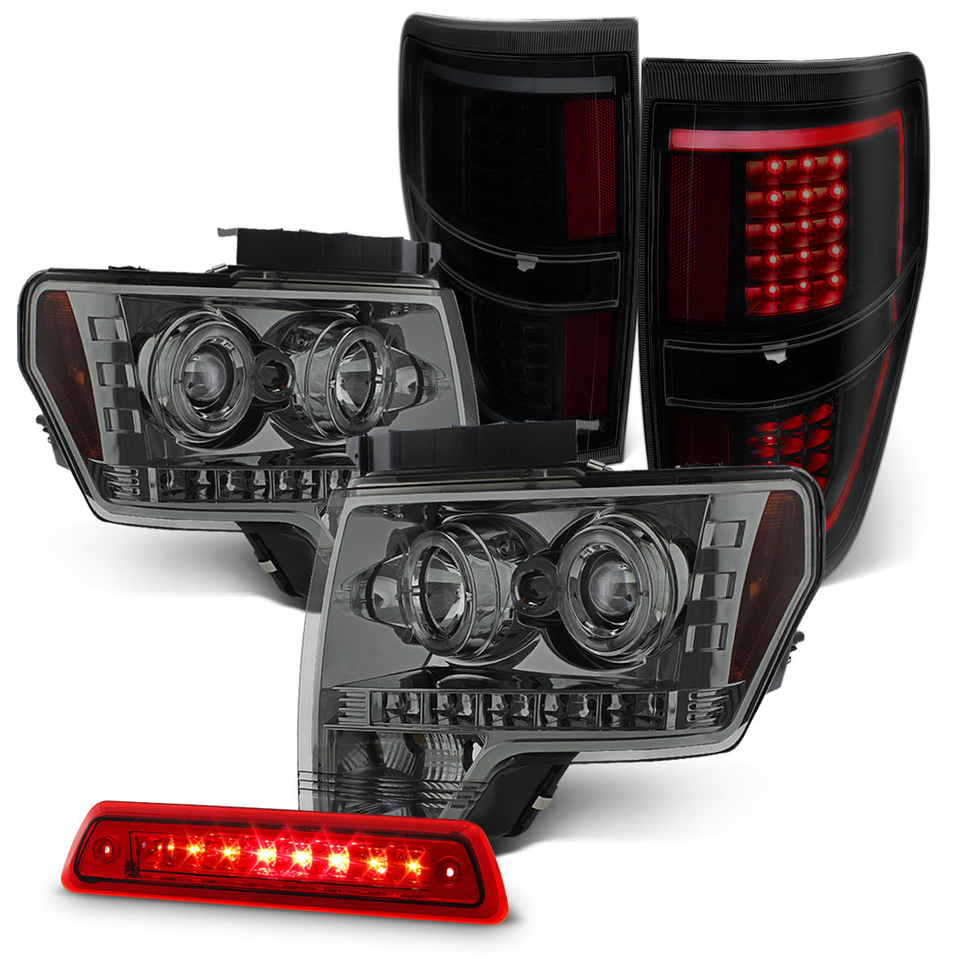 AKKON - Fits 2009-2014 Ford F150 Dual Halo Projector Smoke Headlights + Black Smoked [C-Light Bar] Tail Lamp + Red 3rd Brake