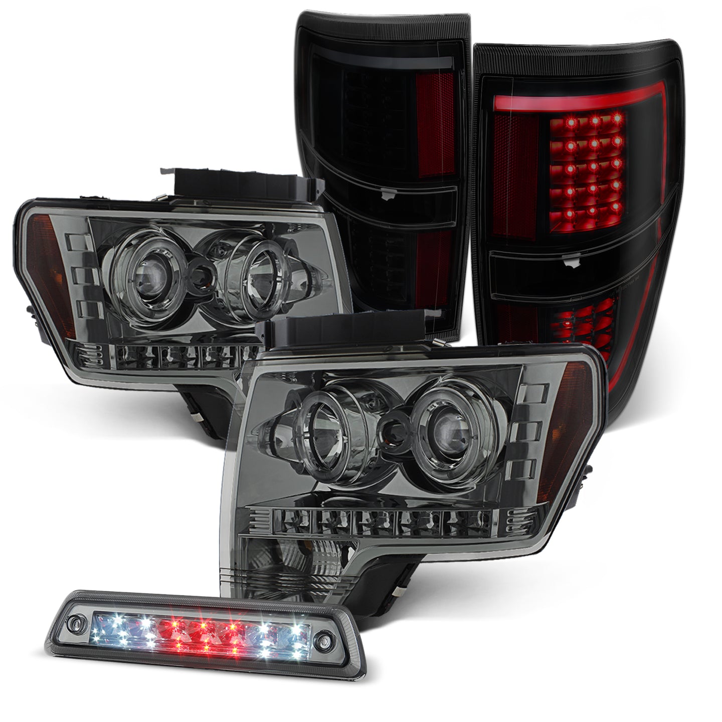 AKKON - Fits 09-14 Ford F150 Dual Halo Projector Smoke Headlights + Black Smoked [C-Light Bar] Tail Lamp + 3rd Brake Lights