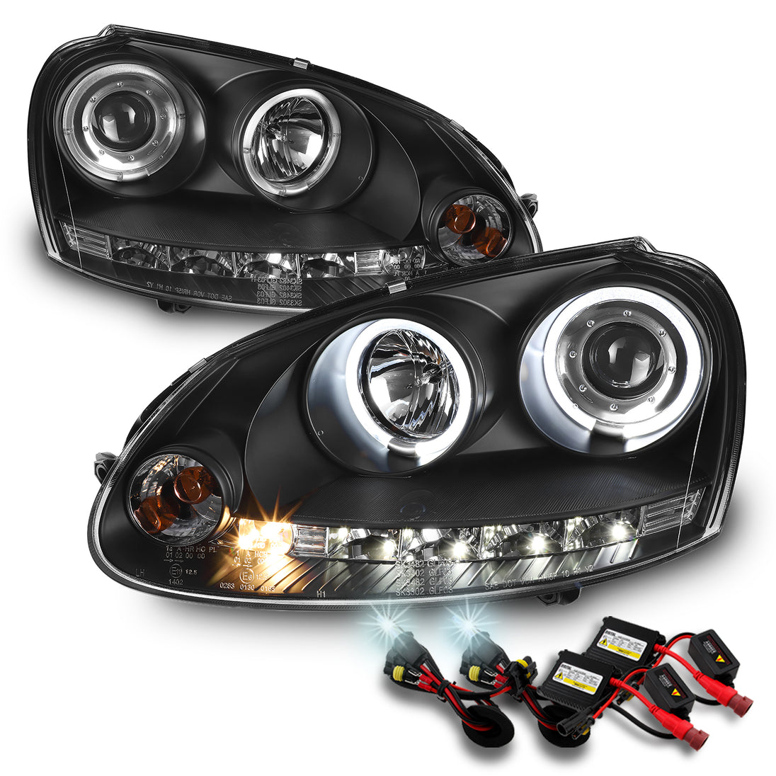 AKKON - For VW Rabbit GTI Jetta R32 Black Bezel Halo DRL LED Strip Halogen Type Projector Headlights + 6K HID