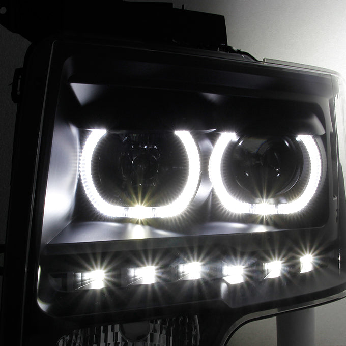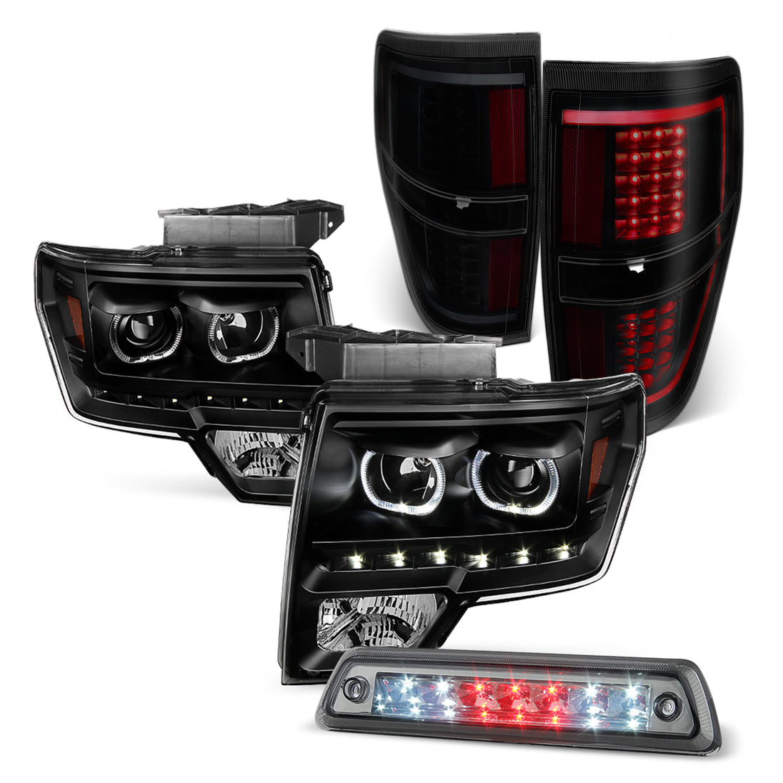 AKKON - For 2009-2014 Ford F150 Dual LED Halo Projector Black Headlight + C-Shape Smoked LED Tail + 3rd Brake Lamp