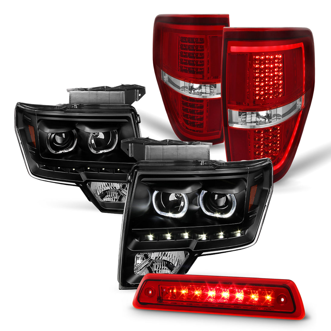 AKKON - For 2009-2014 Ford F150 Dual LED Halo Projector Black Headlight + C-Shape Red LED Tail + 3rd Brake Lamp