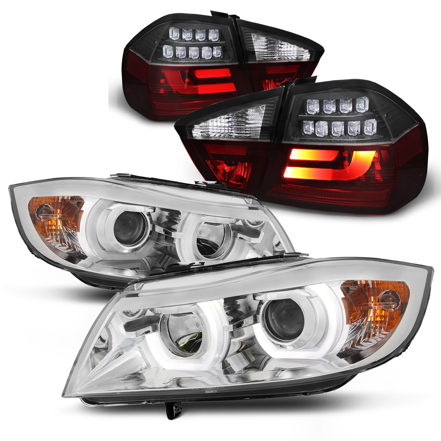 AKKON - For 2006 2007 2008 BMW E90 3-Series Sedan 3D LED U-Halo Chomr Projector Headlights + LED Strip Black Tail lamp