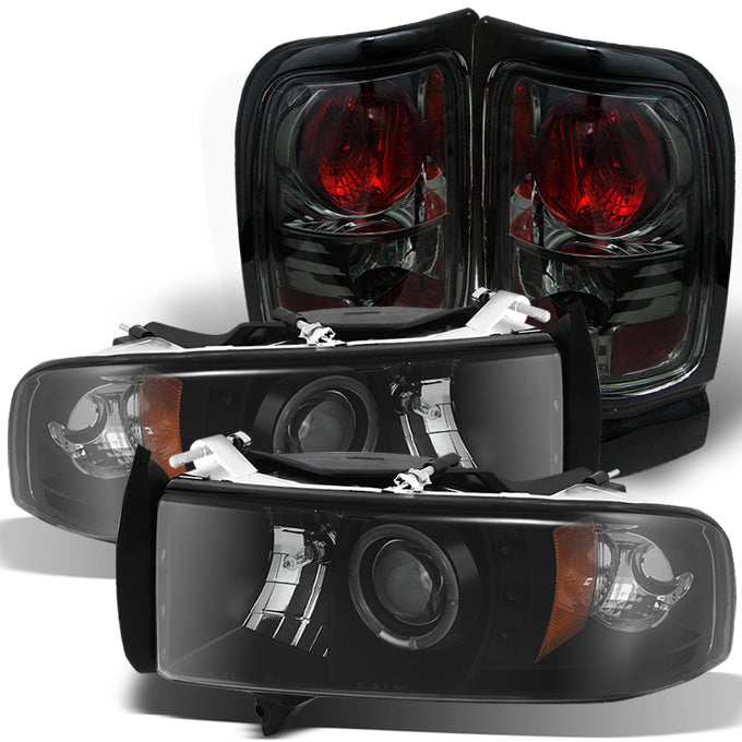 AKKON - For 94-01 02 Dodge Ram 1500/2500/3500 Black Smoke Halo Projector LED Headlights + Smoked Tail Light Lamp
