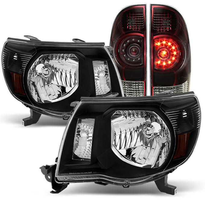 AKKON - For 2005-2011 Toyota Tacoma Pickup Truck Black Headlights + Dark Red Smoked LED Tail Lights Brake Lamps Pair