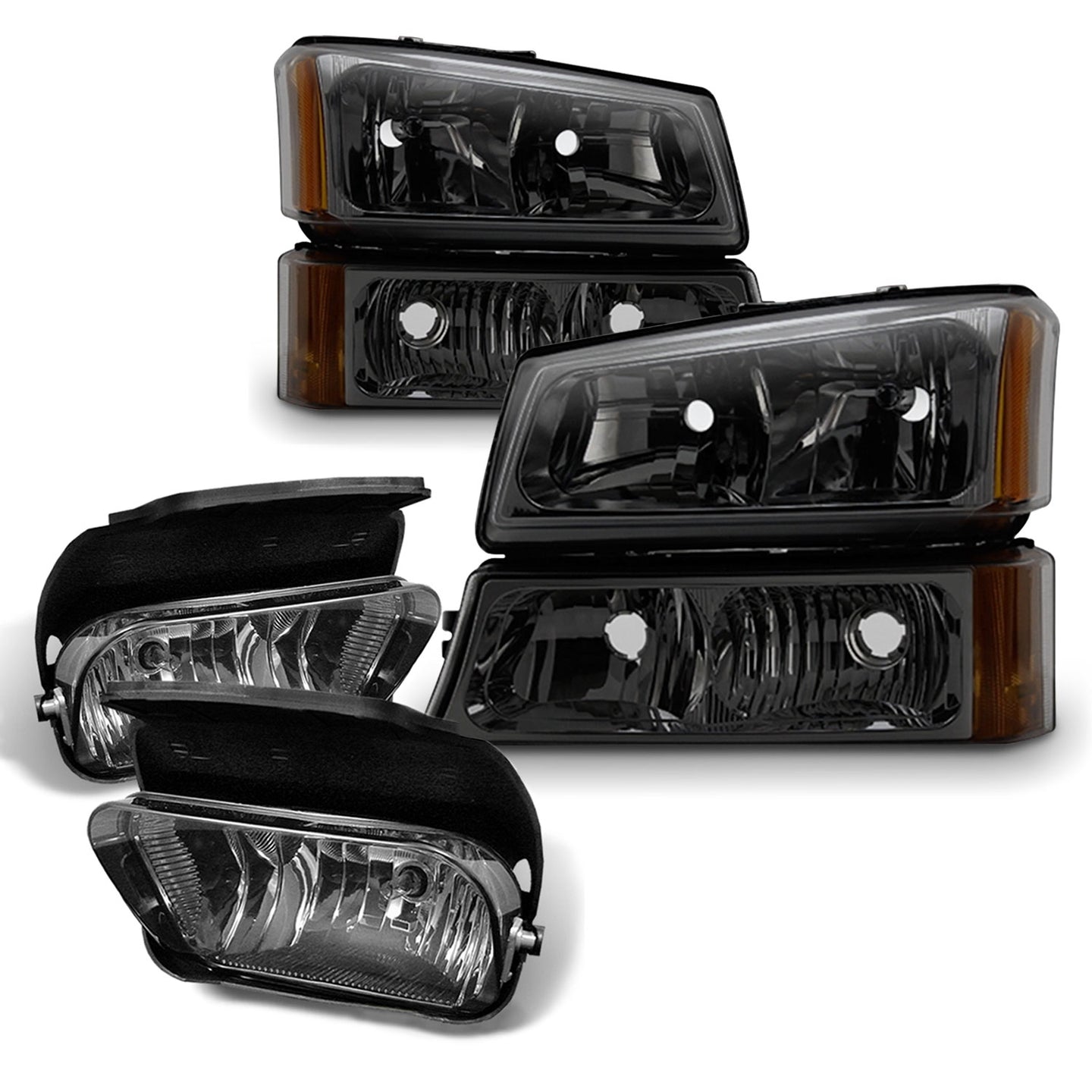 AKKON - Fits 2003-2006 Silverado 1500HD/ 2500HD/ 3500 Avalanche 1500/ 2500 2007 Classic Smoked Headlight + Bumper + LED Fog Lamp