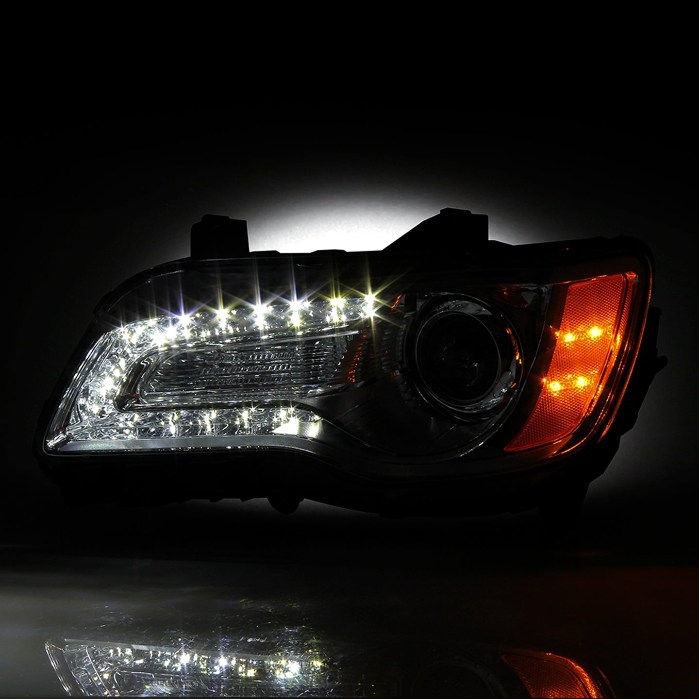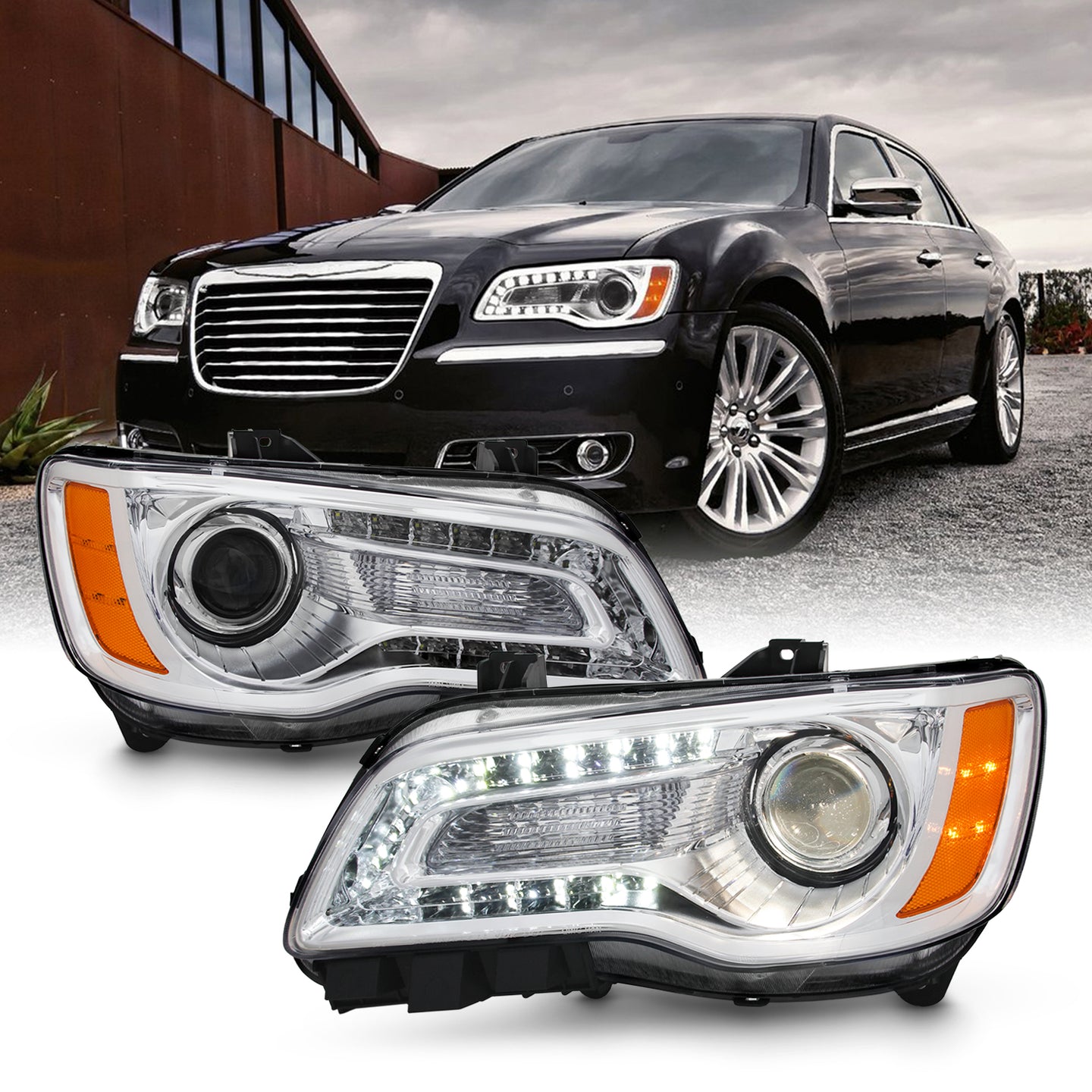 AKKON - Fits 2011-2014 Chrysler 300 Sedan Models LED Light Bar [Halogen Type] Chrome Bezel Projector Headlights Pair Left+Right