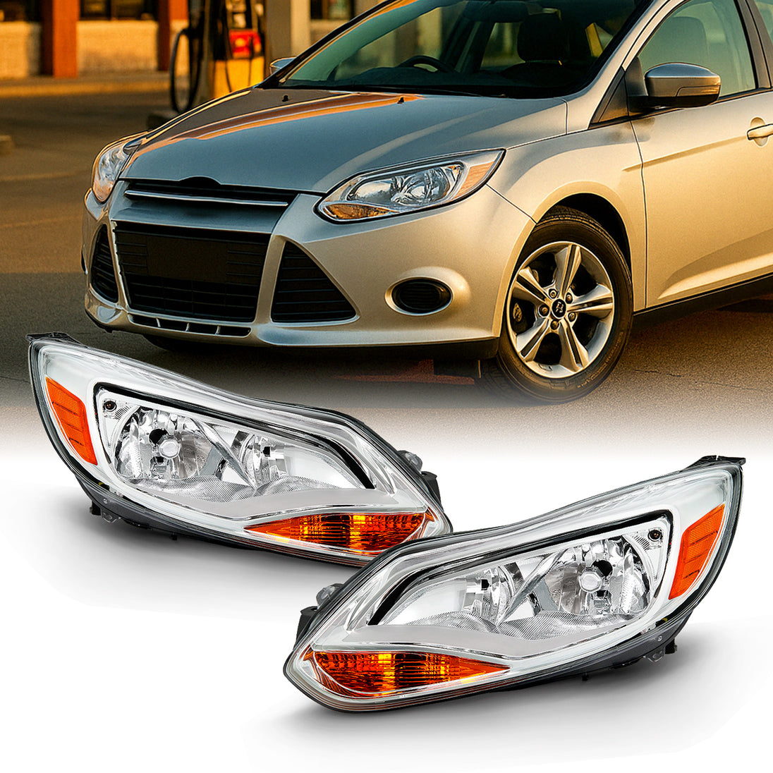 AKKON - Fits 2012-2014 Ford Focus 4Door Sedan Hatchback [Halogen Type] Chrome Trim Headlights Pair Driver Left+Passenger Right