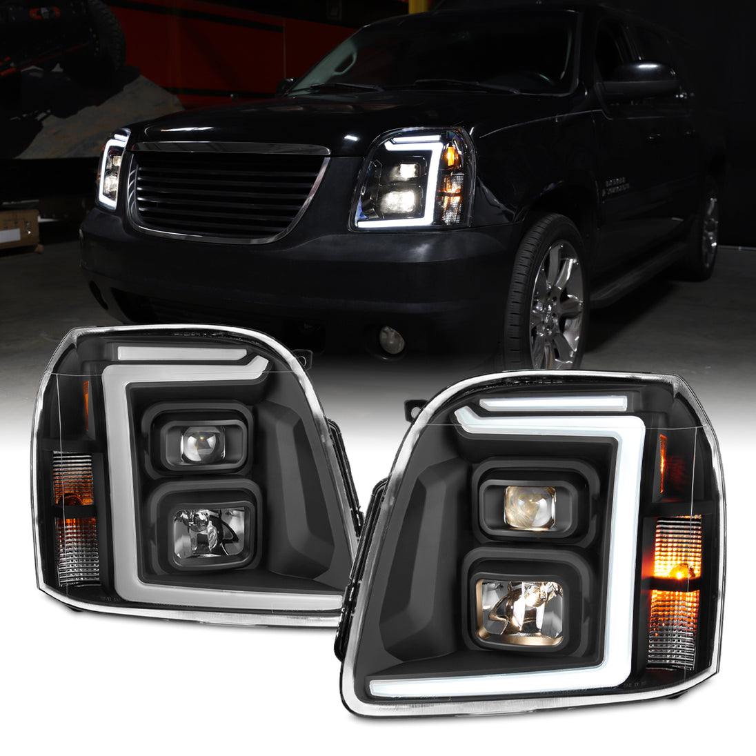 AKKON - Fits 2007-2014 GMC Yukon XL 1500 2500 [LED C-Tube DRL] Projector Black Headlights Headlamp Pair Driver+Passenger