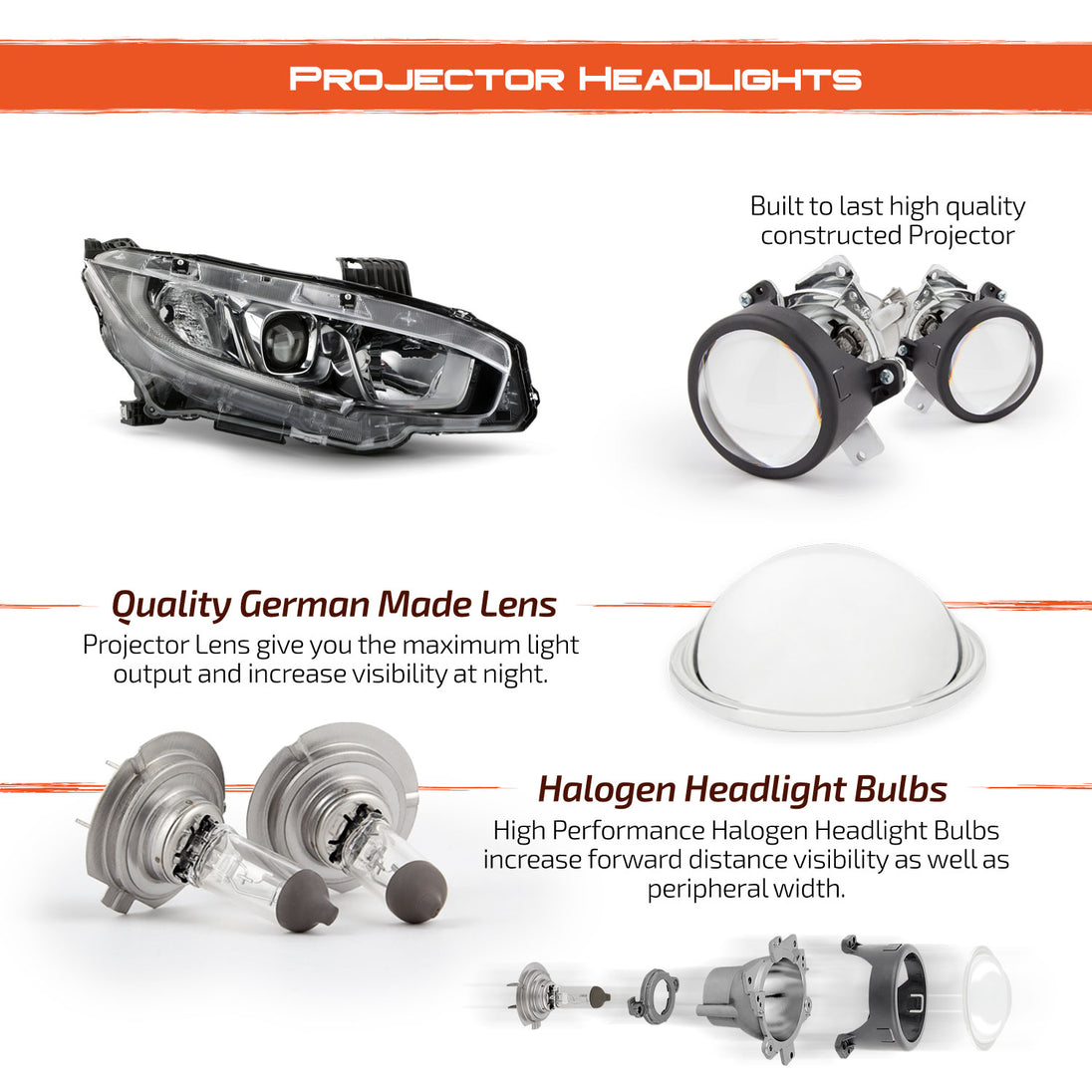 AKKON - Fits 2016-2021 Honda Civic DX EX EX-L EX-T LX LX-P [Halogen Type] Projector Chrome Headlights Pair Left + Right