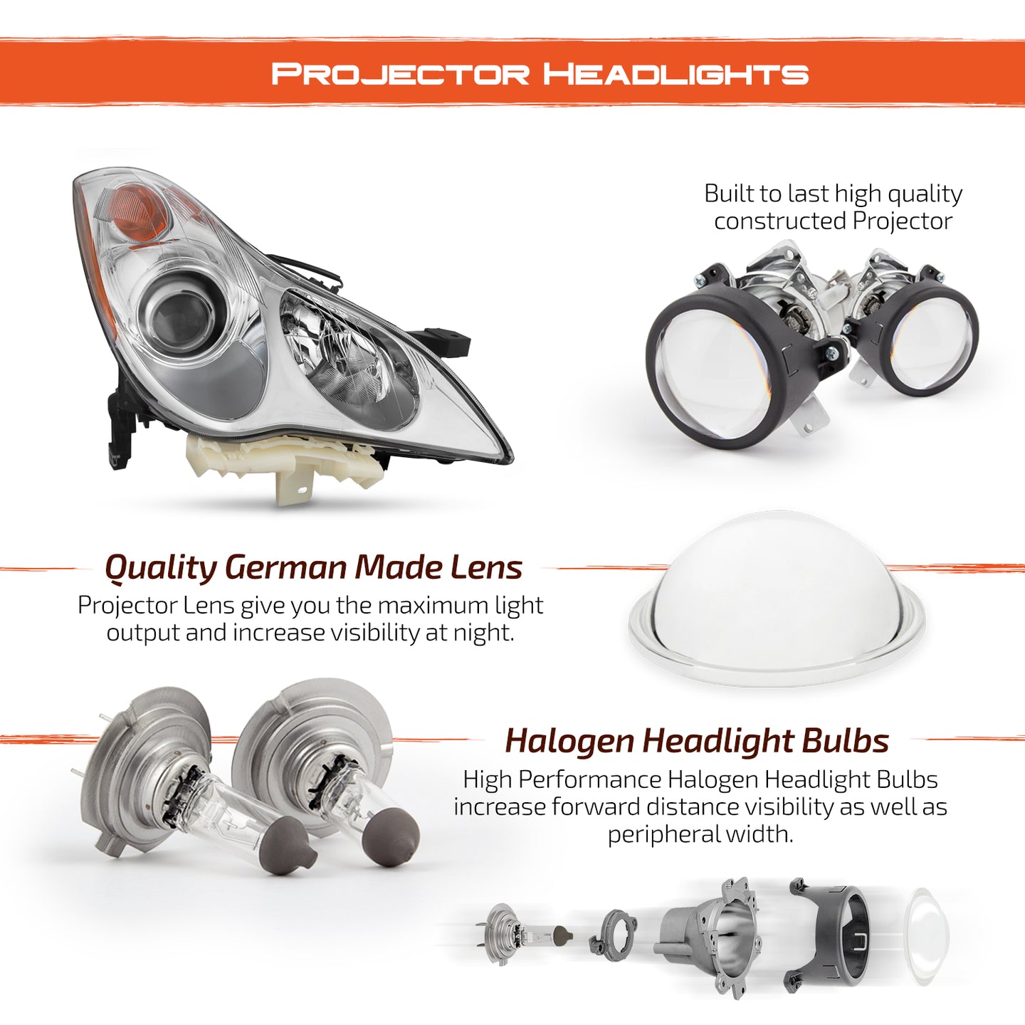 AKKON - Fits 2008-2012 Infiniti EX35 2013 EX37 2014-2017 QX50 [Halogen Type] Projector Chrome Headlights HeadLamp Pair