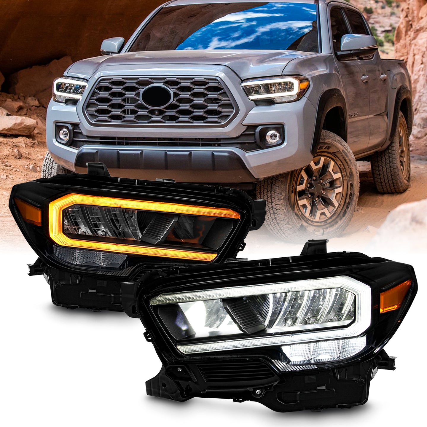 AKKON - Fits 2016-2022 Toyota Tacoma [Full LED] Projector Black Headlights Pair with DRL Running + Sequential Signal