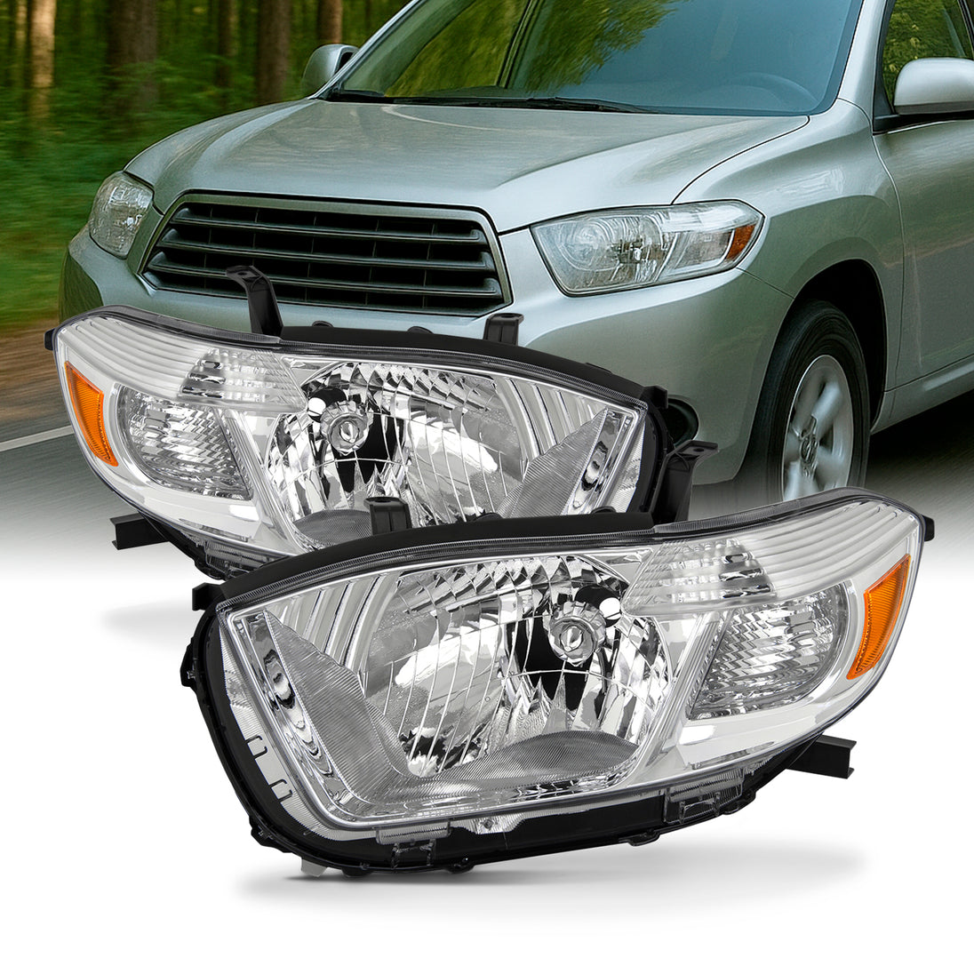 AKKON - Fits 2008 2009 2010 Toyota highlander [Halogen Type] Chrome Headlights Pair Left+Right Replacement